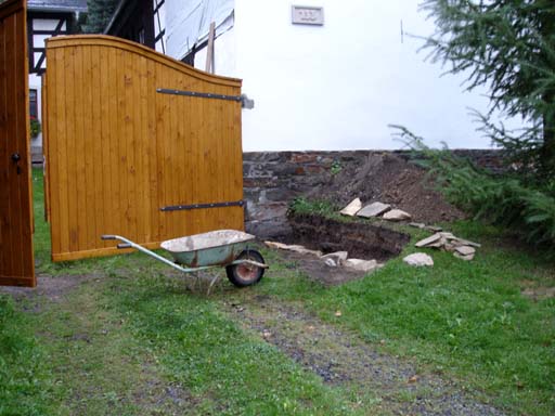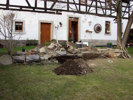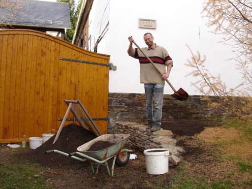 Mit den ersten warmen Sonnenstrahlen im April konnte ich natürlich nicht widerstehen, mir etwas Arbeit zu suchen. Im Hof will ich also unsere größte Dreckecke beseitigen, wo wir immer unseren Bauschutt bis zur Containerabfahrt gelagert haben.