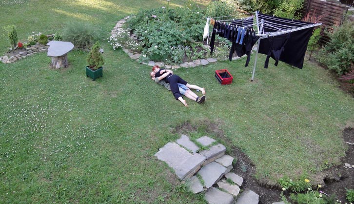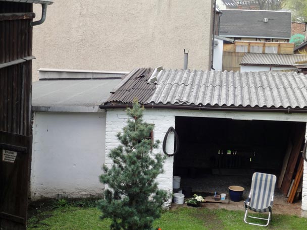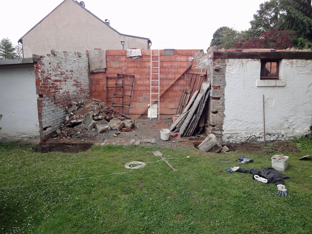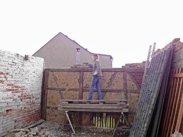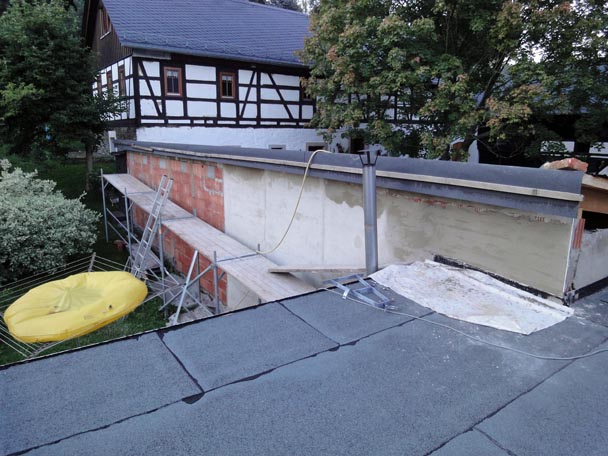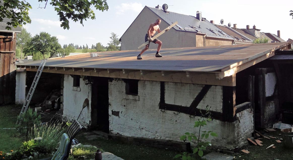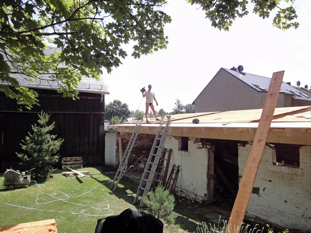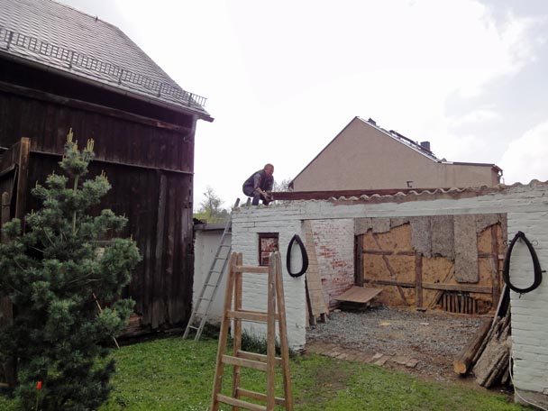 Nein , da unten liegt nicht Ivonne, sondern nur Ihr Pullover. Am Nebengebäude gab es einen kleinen Vorbau, der als Garage fungierte. Um einen durchgehenden Balken, auf dem das neue Flachdach angebunden wird, realisieren zu können, wollen wir den Originalzustand des Gebäudegrundrisses wiederherstellen.