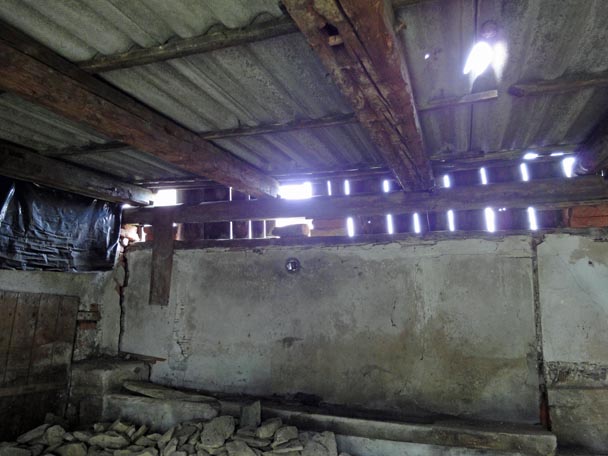 Eigentlich müsste vom letzten Nebengebäude das kaputte Asbest-, Welleternitdach runter. Die Balken darunter sind nur aufgelegt worden. Die gesamte westliche Wand hat somit oberhalb keine Verankerung und wandert ab. Theoretisch müsste sie komplett erneuert werden, da sie sowieso mehr Schein als Sein ist.
