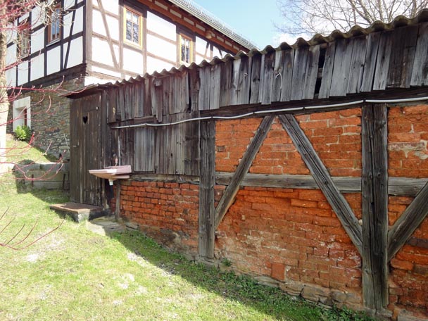 Dieses Nebengebäude hatte auch ganz früher einmal ein Obergeschoß. Als es zu baufällig geworden ist, wurde es abgetragen. Beim Errichten des Flachdaches wurden einfach 3 lange Balken aus dem Dach der großen Holzscheune herausgesägt. Mir als Handwerker dreht sich der Magen um, wenn ich daran denke, so mit der vorhandenen Bausubstanz umzugehen.