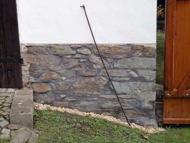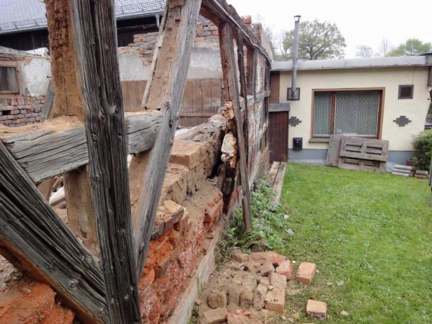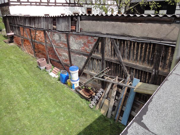 Sie macht schon einen richtigen Katzenbuckel nach draußen. Die weich gebrannten Ziegel sind nass und vom Salpeter angefressen, der Lehm im Lehmstock ist ausgespült und das Fachwerk hält alles noch etwas zusammen - mehr oder weniger. Schön ist jedenfalls was anderes.