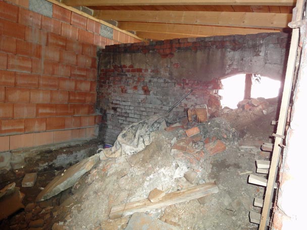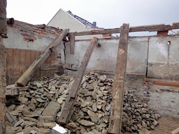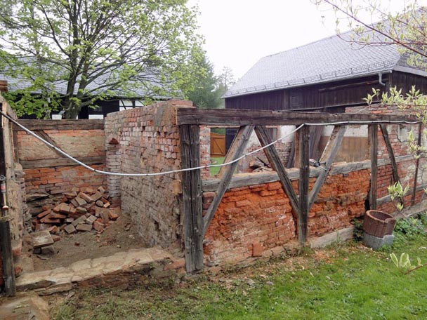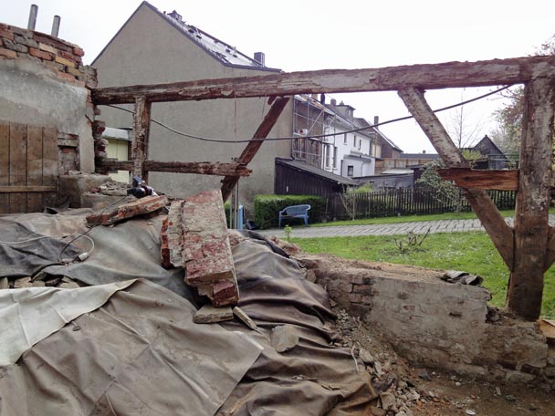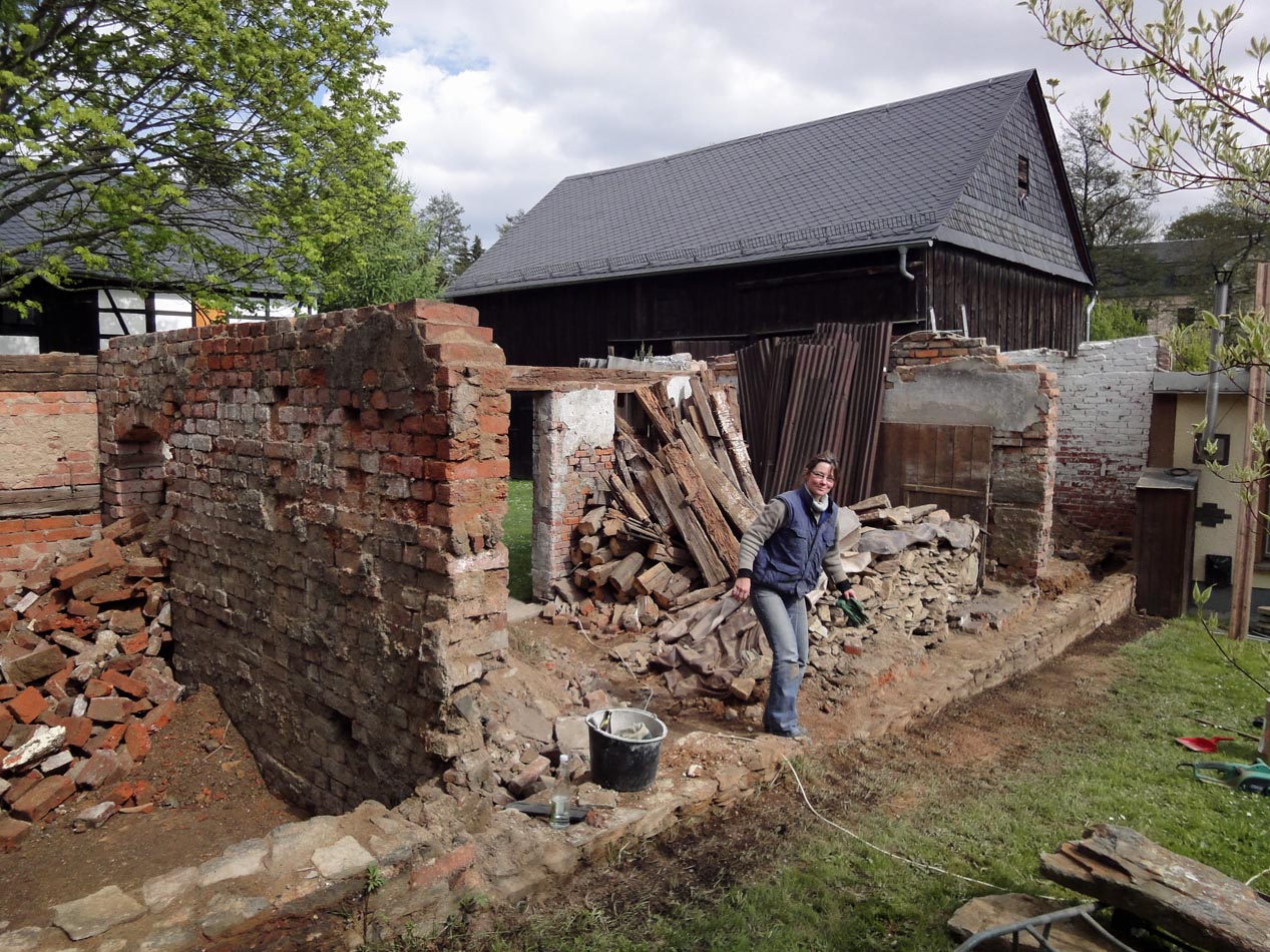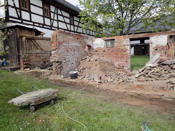 Spätestens jetzt fragten wir uns schon, wozu wir dieses Nebengebäude eigentlich brauchen. Das, was noch steht, wäre mit etwas an schubsen jedenfalls schnell weg. Rein nutzungsbedingt, materiell und logisch gesehen rechnet sich der Wiederaufbau in keiner Weise.