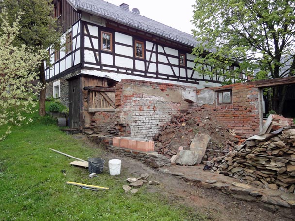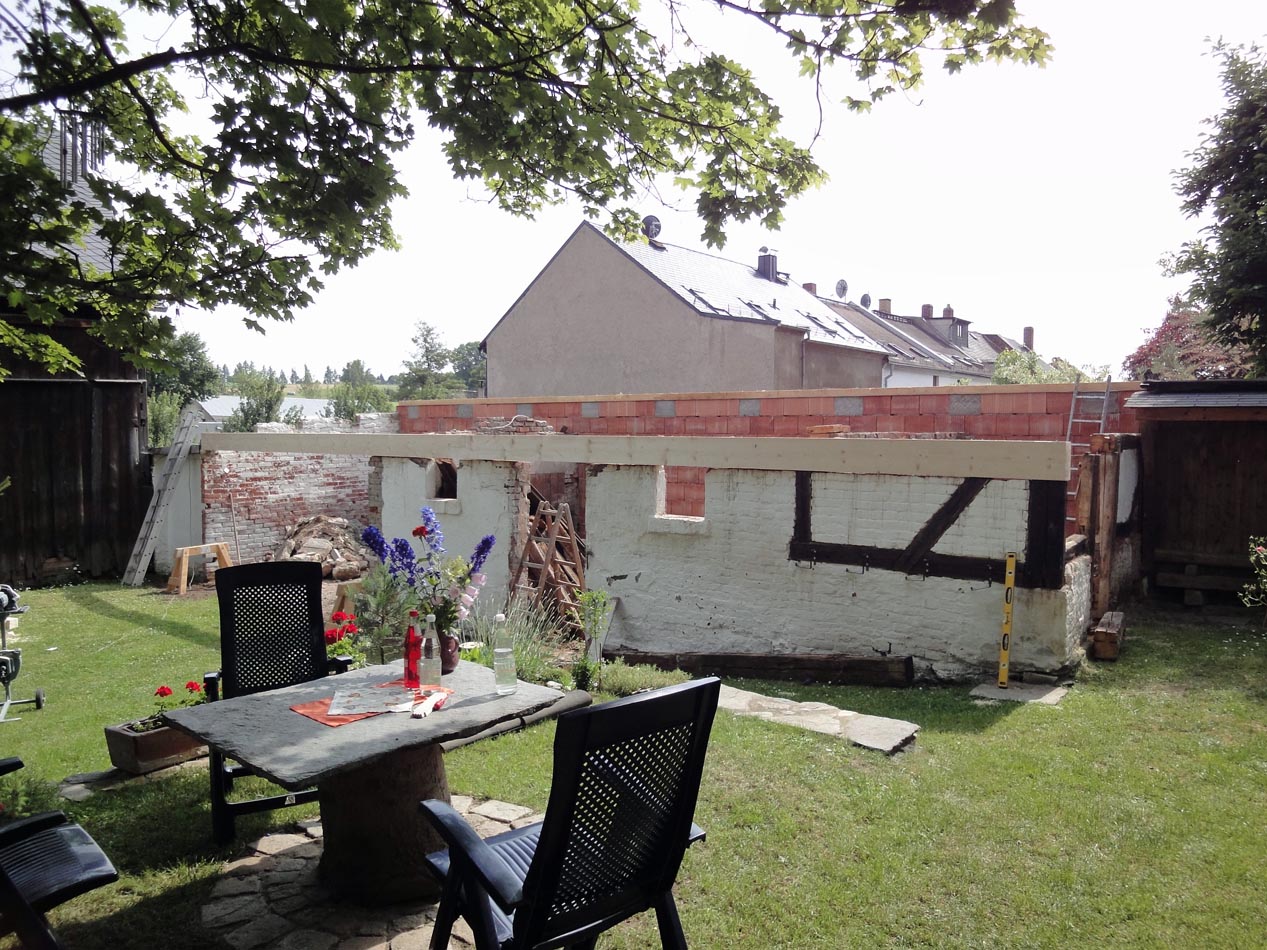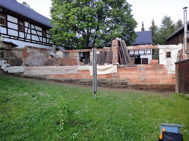 Richtig - weil wir einen an der Klatsche haben und deswegen werden wir hier weitermachen. Die Rückseite wird wetterseitenbedingt aber leider nicht mehr aus Fachwerk bestehen, sondern wird auf gemauert. Dafür schwebt uns aber auf der hofzugewandten Seite schon noch ein kleines Highlight mit neu zu errichtendem Fachwerk vor, um den Charakter des Gebäudes zu erhalten.