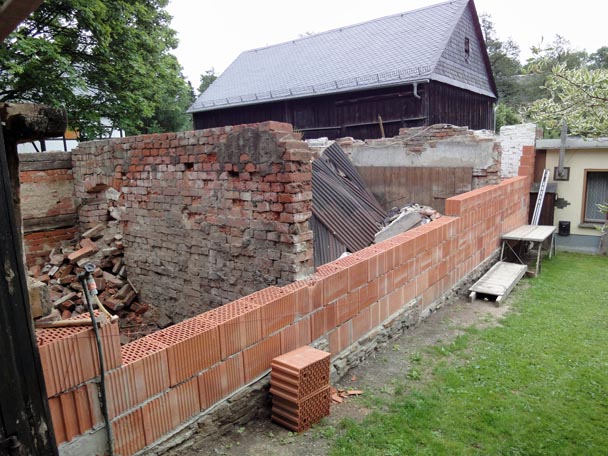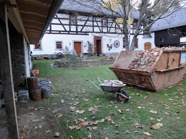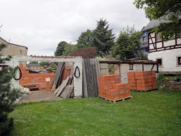Zu faul zum Umfallen ist jedenfalls die richtige Bezeichnung für manche Teile der Wand. Da wir einen kleinen Autoanhänger noch aus Zonenzeiten haben, wurde der Bauschutt sporadisch entsorgt. Für den großen Teil muss aber später bestimmt mal was Größeres her.