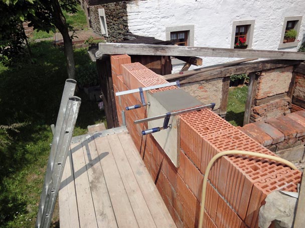 In die letzte Ziegelreihe meiner Wand goss ich Betonabsätze ein, um dort einen Querbalken befestigen zu können, der das Dach trägt.