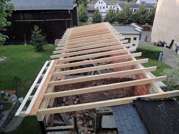 So dann kam wieder mein guter Nachbar Uwe Planitzer ins Spiel und lieferte / legte nach dem dicken Querbalken die Sparen für das neue Flachdach auf. Sie wurden natürlich fachgerecht mit den Mauern verbunden.