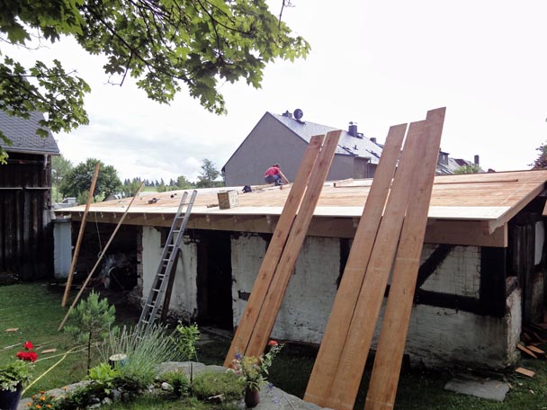 Uwe lieferte uns auch günstig die Dachschalung. Das Aufbringen derselben ist dann aber wieder unser Part.