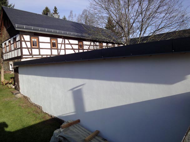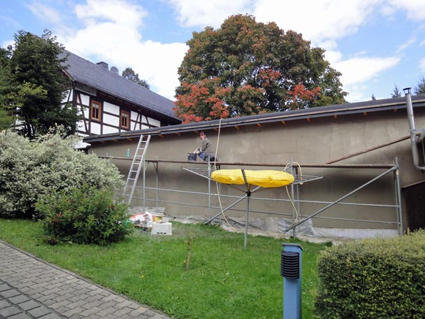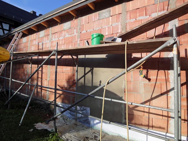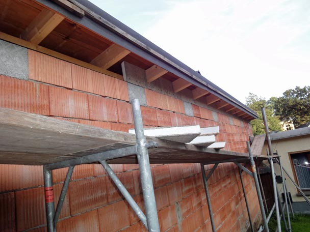 Zusammen zogen wir den Feinputz auf. Während Ivonne der Wand dann noch ein weißes Gesicht gab, ging ich daran die Dachrinnenhalter zu versenken.