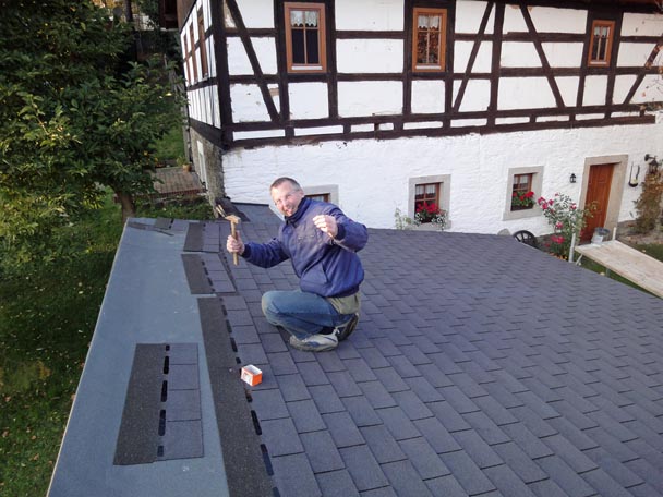 Im Oktober wurde es schon recht kühl und die Finger kalt beim Schindeln aufnageln. Bei der Größe der Dachfläche war dies auch nicht an einem Tag gemacht. Langsam verließ mich nicht nur die Lust, sondern auch die Kraft. Für dieses Jahr hatte ich es einfach satt.