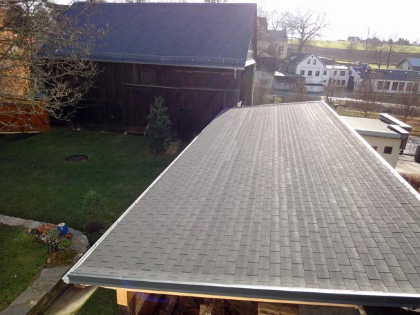 Nach dem Verschalen und Setzen der Randkeile nagelten wir bei 25 Grad im Schatten noch die Dachpappe auf. Am letzten Tag vor unserem Urlaub war es geschafft. Genau so weit wollte ich noch kommen, damit die Schalbretter noch etwas trocknen können, bevor wir die Dachschindeln aufbringen.