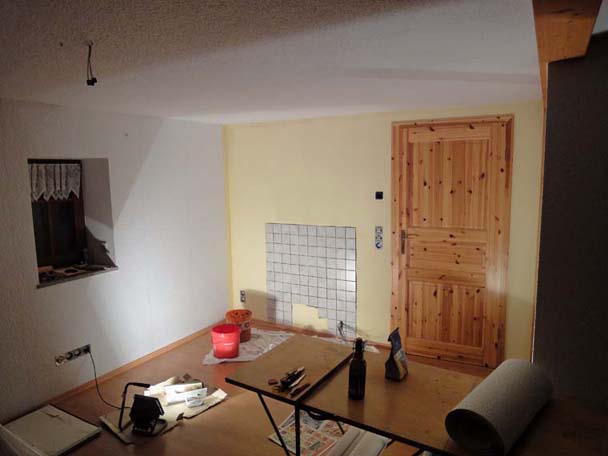 Wieder zu Hause angekommen kümmerte Ivonne sich um die hintere Wand unseres Wohnzimmers. Beim Umdrehen fiel nun schon der Unterschied zur rückwärtigen Außenwand auf. OK - das ist jetzt wieder mein Part, auch damit sich Ivonne auf Ihre Fahrschule konzentrieren konnte.