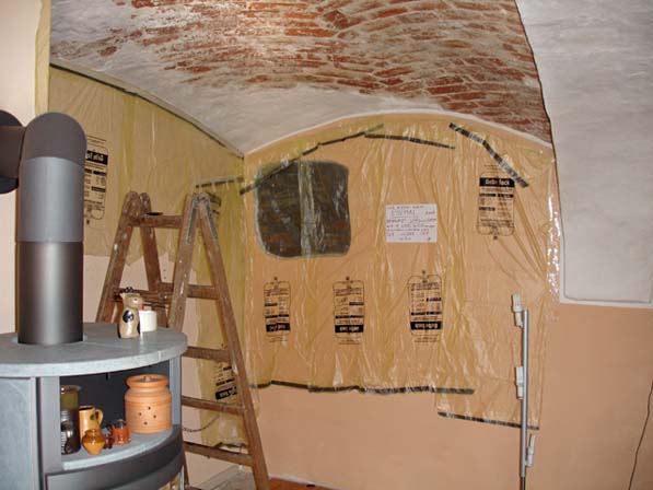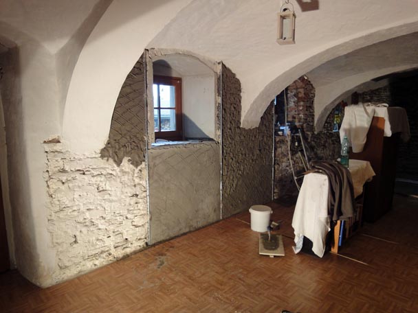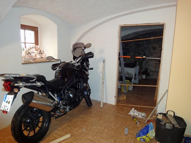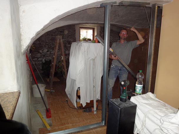 Wegen der kühlen Temperaturen im Winter zog ich im Gewölbe eine Trockenbauwand zur Halbierung der Fläche ein. Bisher hatten wir uns im Winter an dieser Stelle mit Decken beholfen.