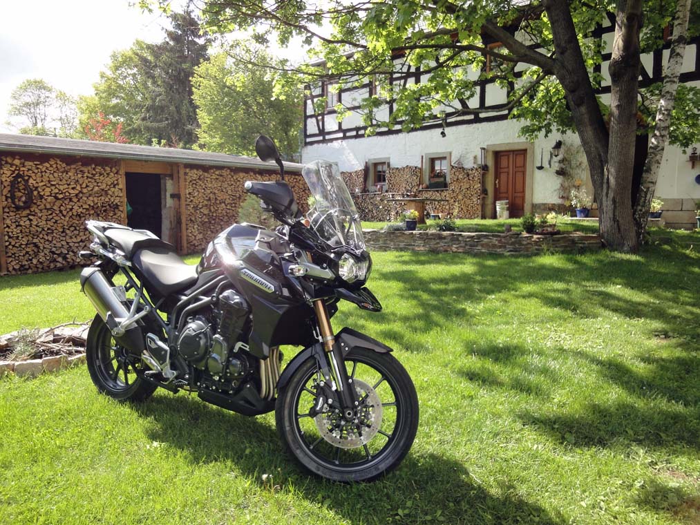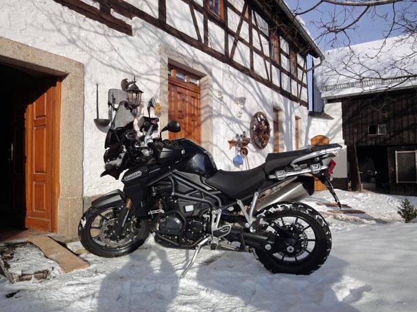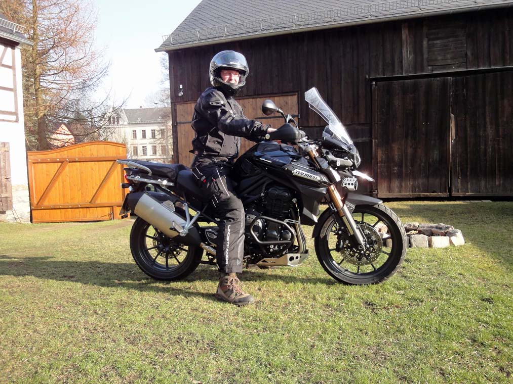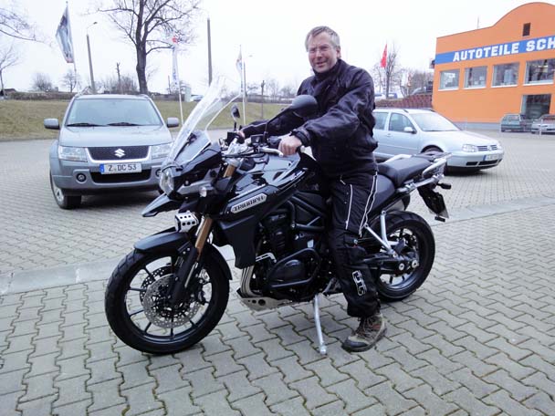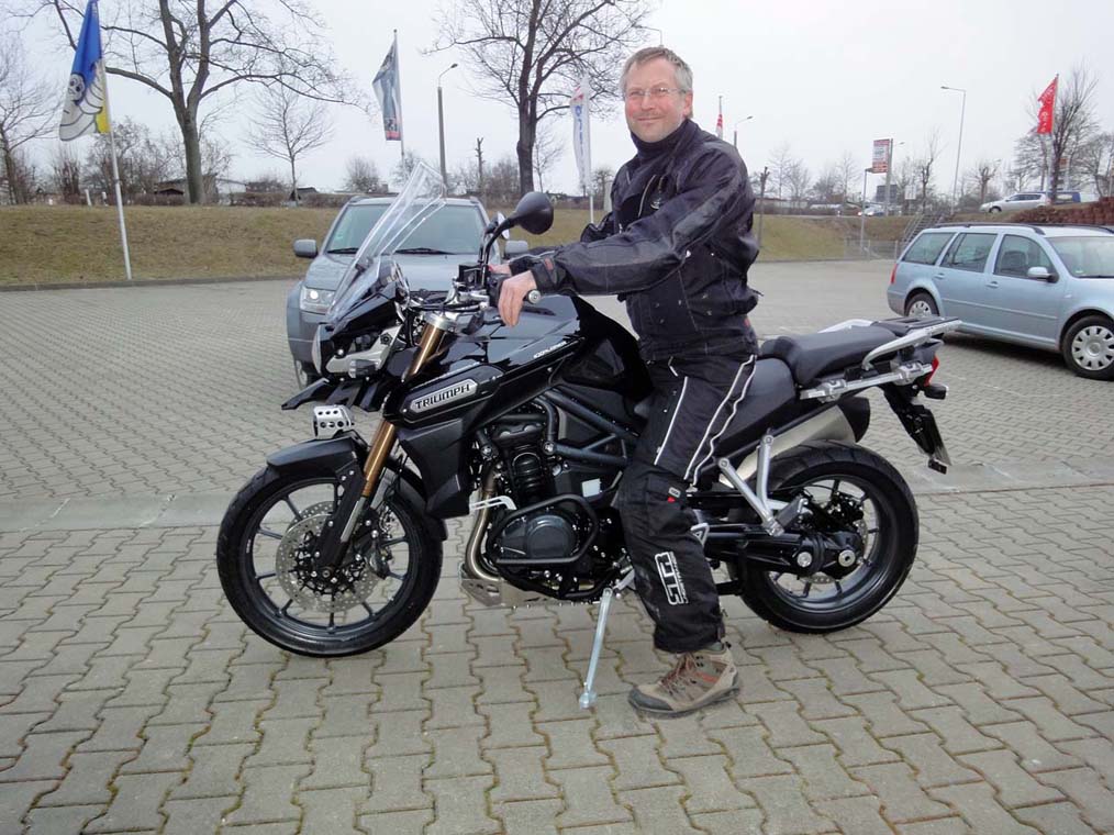"Zufällig" bekam ich Wind davon, das der Triumph Händler in Zwickau eine brandneue Tiger Explorer zu stehen hat. " will ja bloß mal gucken" dachte ich mir. "Längere Probefahrt nur bei echter Kaufabsicht" - versuchte er mir zu erklären. "Aber ne Runde um´s Objekt kannste machen". Skeptisch schwang ich mich auf dieses, meiner Meinung nach, zu wuchtige Ding (aber in schwarz sah sie schon mal ziemlich geil aus).