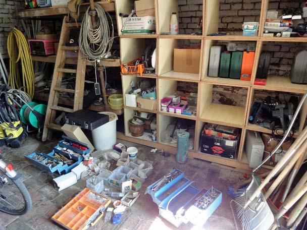 In unsere Werkzeuggarage hatte ich zwar immer schon versucht, alles relativ ordentlich zurückzulegen, doch beim Versuch ist es aus Zeitmangel auch meist geblieben. Also räumte ich dort mal gründlichst auf, sortierte jedes Schräubchen und mistete grundlegend aus. Davor hatte ich mich schon Jahre gedrückt.