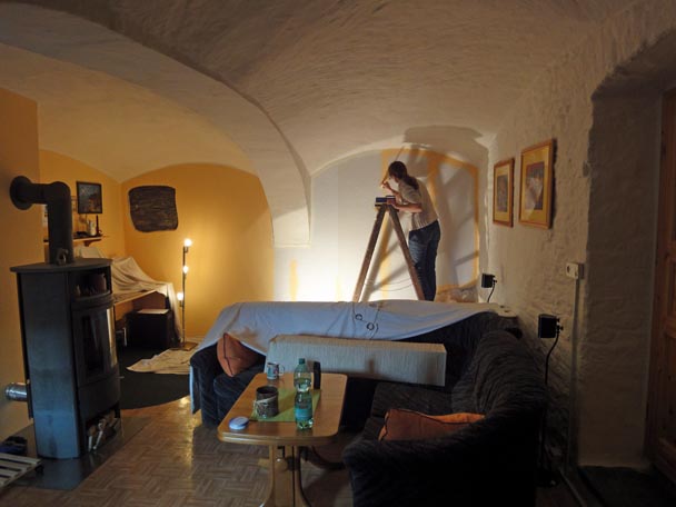 Ivonne hackte im Kuhstall - äh, ich meine unser Wohnzimmer, lockeren und versalzenen Putz von der Decke und zog hinterher Neuen wieder auf.