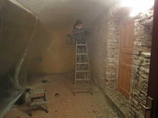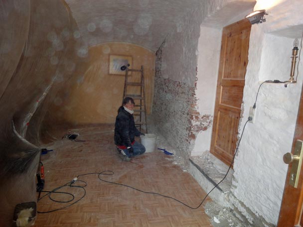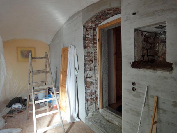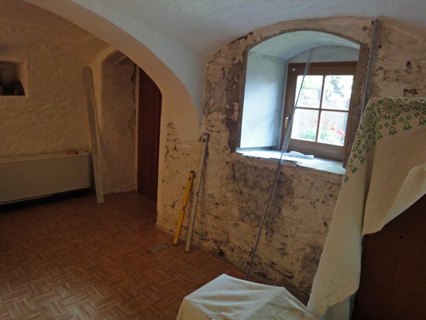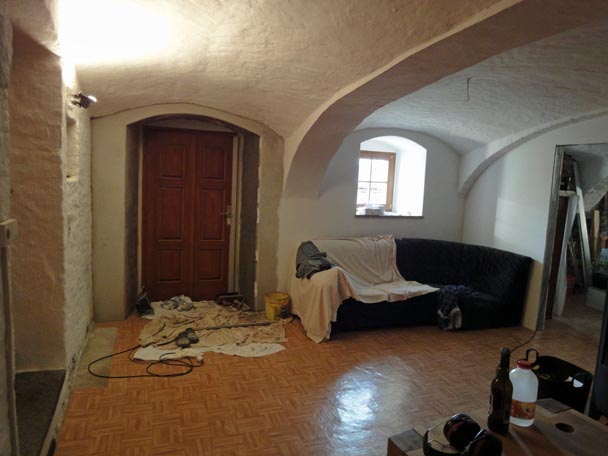 Dieser ehemalige Kuhstall ist übrigens wirklich unser Wohnzimmer. Um noch etwas "wohnen" zu können, teilten wir es mit Folie, wegen des vielen Drecks, mittig am Gewölbebogen ab.