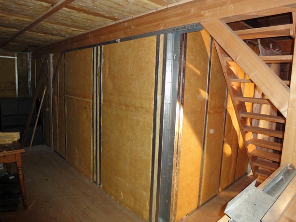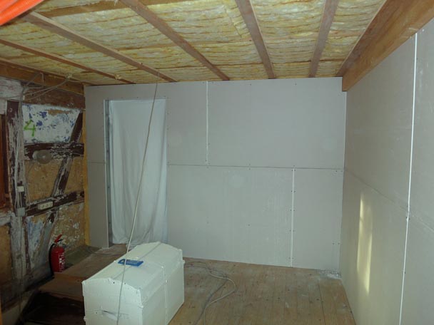 Da langsam der Winter und die Kälte mit Macht kamen, beplankte ich nur innenseitig den Trockenbau und dämmte Ihn noch.