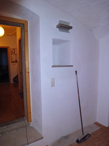 Wenigstens den vorderen Teil der Wandseite wollte ich sauber verputzen. Bis zu 4 mal musste auf ein und dieselbe Stelle aufgeputzt werden, um der in alle Richtungen krummen Natursteinwand ein gerades Gesicht zu geben.