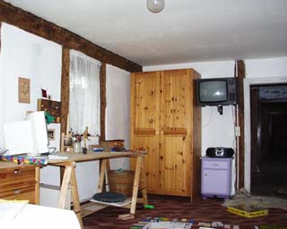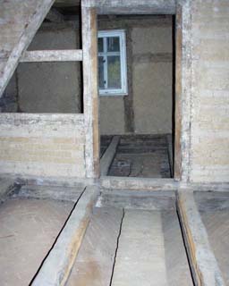 Herausreißen aller Stein und Holzfußböden in der 1. Etage. Handausschachten aller Fußböden um bis zu 50 cm. Das Gewicht des vermoderten und mit Schiefergestein vermischten Aushubes betrug 50 Tonnen !