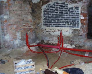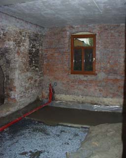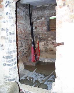 Verlegung im Fußboden sämtlicher Kabel für Telefon, Fernsehen, Nachtspeicherheizung und Elektroinstallation. Einbringen Frostschutz und Unterbeton in WC, Bad, Hausflur und Wohnungsflur.