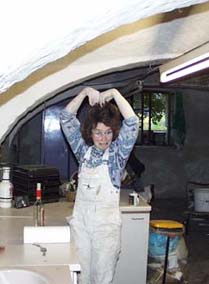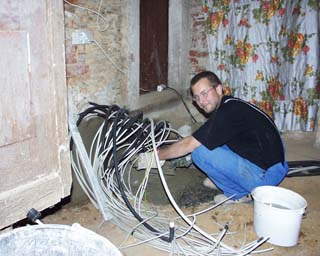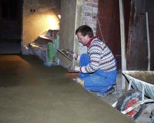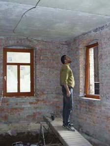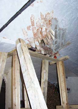 Herausschneiden alter Dielen im Obergeschoss und Säuberung der Gewölbebögen von oben zwecks späterer Verfestigung . Dabei wurden auch ein paar alte Mieter gefunden - zwei Igel, eine Ratte und ein Marder. Leider waren nur noch die Skelette übrig und somit gab es abends wieder nur Wurstbrot an Stelle von Gulasch !