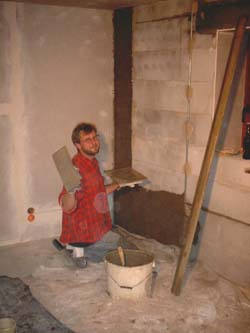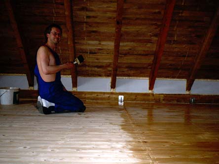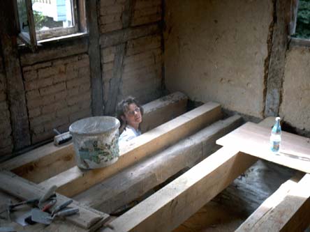 Dielung Obergeschoß Flur. Und natürlich helfen die Kinder auch bei vielem mit. Da darf Frank auch schon mal einen Container vollschippen - besser jedenfalls als den ganzen Tag vor dem PC.