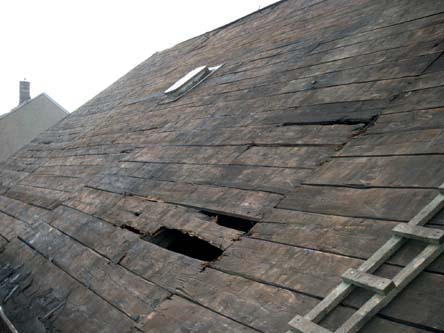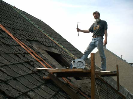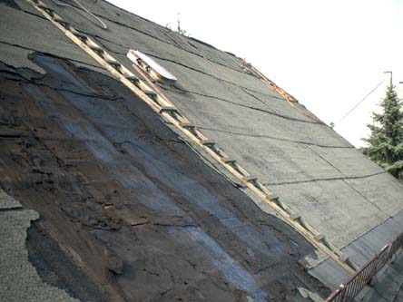 Danach war die Straßenseite dran. Die Dachpappe war in Auflösung begriffen. Die Dachschalung unten drunter auch ! Also komplett runter.