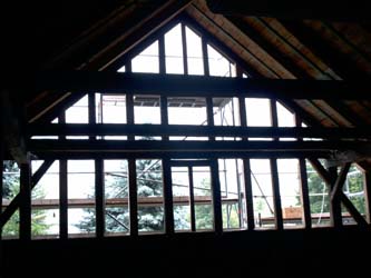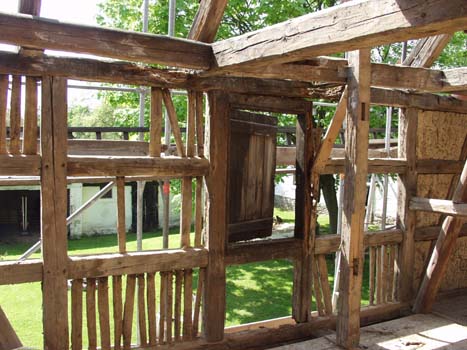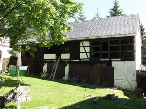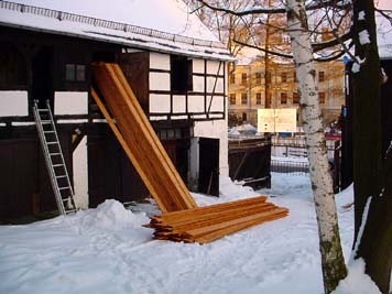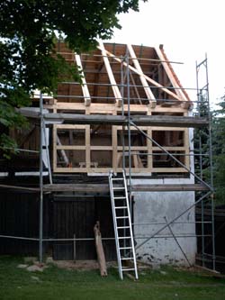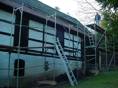 Die Fachwerk - Außenwand musste auf eine Länge von 6 m komplett erneuert werden. Das Ausfachen des Fachwerkes wollen wir später machen.