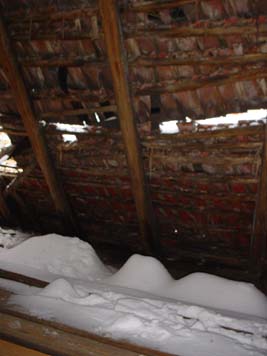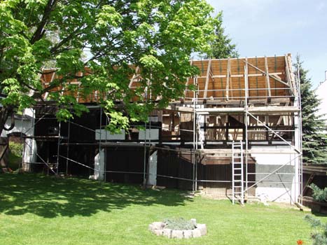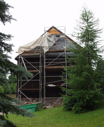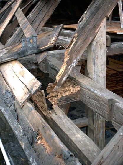 Auf der Westseite kamen wir ohne unseren Zimmermann nicht mehr zu Fach. Die linke Dachseite konnte mit ein paar Balkenauswechselungen gerettet werden. Die rechte Dachseite hatte sich schon abgesenkt und stand wohl kurz vorm Zusammenbruch.