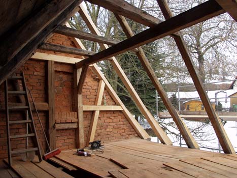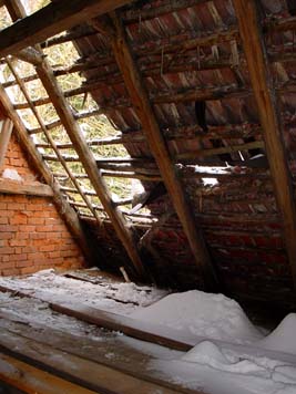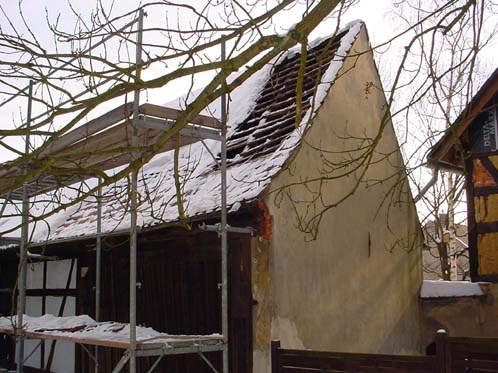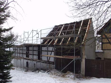 Da trotz noch vorhandenen Daches im Nebengebäude Schnee lag, habe ich schon mal mit dem Dachabriss angefangen. Ob es nun so oder so reinschneit ist ja egal. Das Einiges an Balken und Sparren ausgewechselt werden muss, ist klar. Alle Aufschieblinge taugen auch maximal noch als Feuerholz.