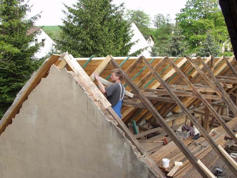 Im April waren wir dann so weit, das wir die Ostseite verschalen und die Spannbahn aufziehen konnten. Die andere Dachseite ist die Westseite und von der Substanz bestimmt schlechter ( Sparrenauswechselungen ). Daher wurde noch kein Schiefer aufgenagelt, sondern ich stellte das Gerüst dieses Jahr das 2. Mal um.