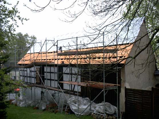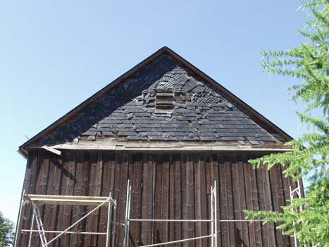 Also stellte ich das 4. Mal das Gerüst um. Langsam hab´ ich ja Übung damit. Die alten Schiefer aus dem Jahr 1854 wurden abgenommen und die Schalung darunter komplett erneuert ( plus ein paar morsche Balken ).