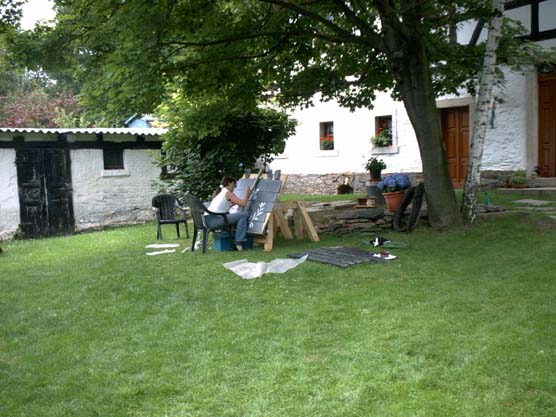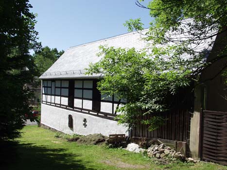 Wir haben das Dach natürlich so gebaut, das es ein wenig über den Giebel mit Überhang steht, da ansonsten wie vorher der Regen den Putz herunter läuft. Der Spalt zum überhängenden Dach wurde zugemauert und verputzt, sowie schadhafte Putzstellen erneuert. Dann durfte Frank an den Kärcher gehen und die Fassade reinigen. Ich spielte hinterher Maler und veredelte die Sache mit Fassadenfarbe. Die Holzfenster für Scheunen - und Nebengebäudegiebel habe ich nach dem Original neu nachgebaut.