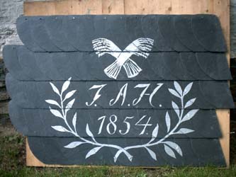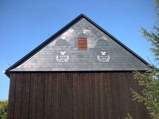 Als i - Punkt unserer 3 neuen Dächer, die enorm viel Kraft gekostet haben, wurde mit viel Liebe von uns und unserem Dachdecker der Giebel wieder Original mit neuem handgehauenen Naturschiefer hergerichtet. Auch die Beschriftung wurde von uns genau nach Vorbild wieder aufgetragen.