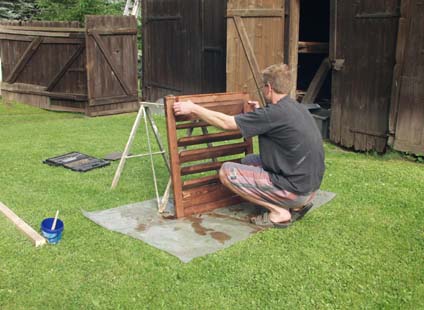 Nach Anbringen des Unterbaus konnte ich dann mit den Kindern die Balken ran heben und befestigen. Das mehrfache Streichen, Zurechtschneiden und Anschrauben der Zwischenbretter war eine Fleißarbeit, bei der ich über 1000 Schrauben verarbeitete.