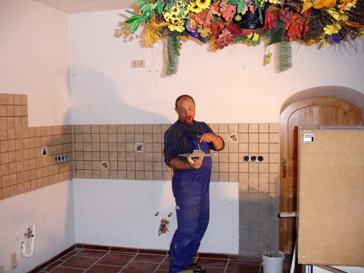 Da Ivonne einen Krankenhausaufenthalt hatte, wollte ich sie überraschen und unsere Küche so weit wie möglich vollenden. Bisher hingen an der krummen Decke noch die Elektrokabel, weil wir mal von einer schönen Holzdecke geträumt hatten. Die Wände hatten wir nach dem Verputzen nur schnell rausgeweist, um einziehen zu können.