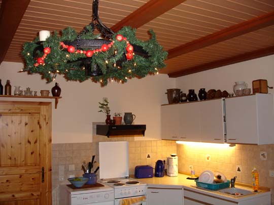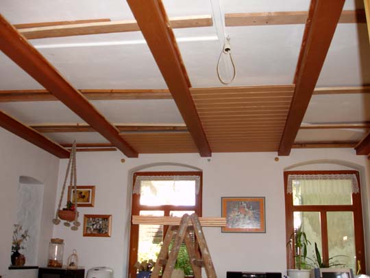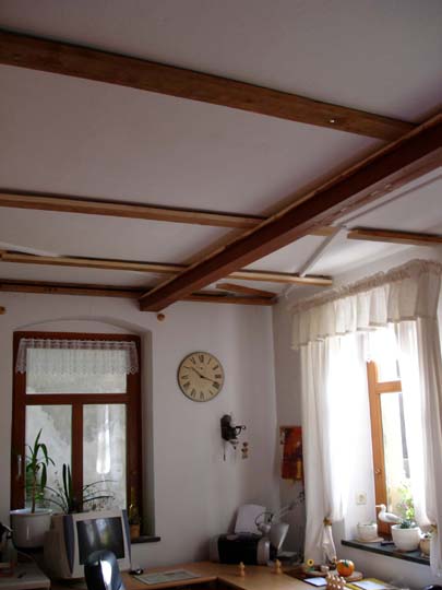 Als Decke stellte ich mir eine Echtholz - Holzbalkendecke vor, wie in einer alten Bauernküche damals üblich.