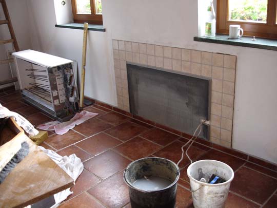 Da ich einmal dabei war, flieste ich auch gleich noch den Nachtspeicherofen ein und setzte hinter ihn noch eine Wärmedämmplatte. Als Abschluss wurde natürlich noch vorgerichtet, wobei mir meine Mutter half.